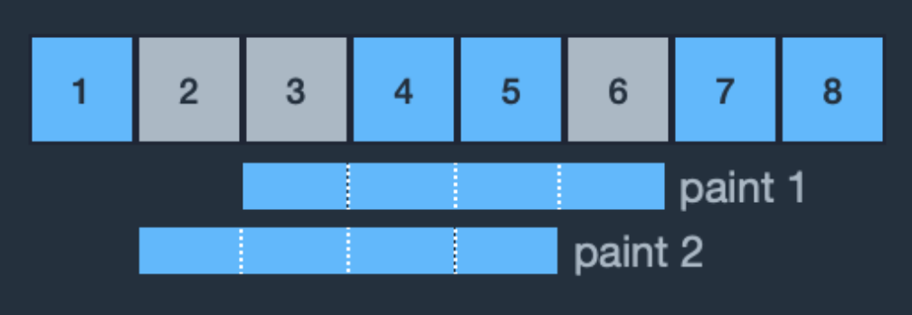 - 예제 1번은 2, 3, 6번 영역에 페인트를 다시 칠해야 합니다. 롤러의 길이가 4미터이므로 한 번의 페인트칠에 연속된 4개의 구역을 칠할 수 있습니다. 처음에 3, 4, 5, 6번 영역에 페인트칠을 하면 칠해야 할 곳으로 2번 구역만 남고 1, 2, 3, 4번 구역에 페인트칠을 하면 2번 만에 다시 칠해야 할 곳에 모두 페인트칠을 할 수 있습니다.