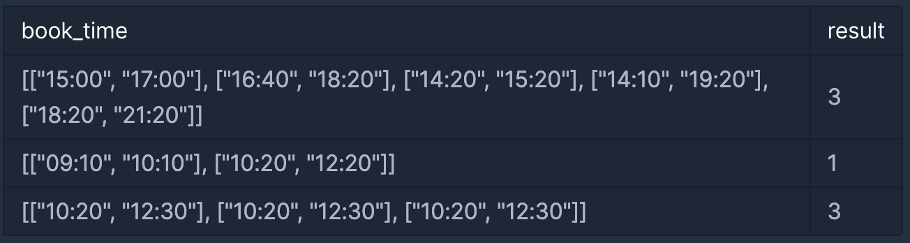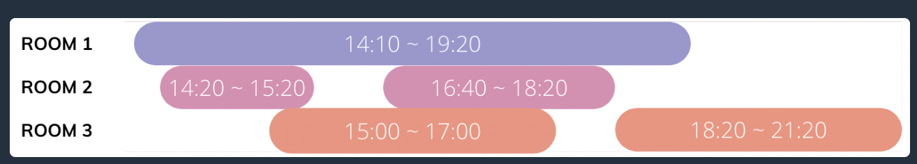 예약 시각이 문자열 형태로 담긴 2차원 배열 book_time이 매개변수로 주어질 때, 코니에게 필요한 최소 객실의 수를 return 하는 solution 함수를 완성해주세요.