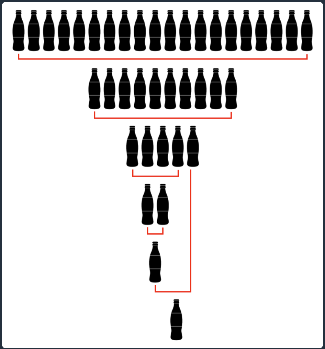 문제를 풀던 상빈이는 콜라 문제의 완벽한 해답을 찾았습니다. 상빈이가 푼 방법은 아래 그림과 같습니다. 우선 콜라 빈 병 20병을 가져가서 10병을 받습니다. 받은 10병을 모두 마신 뒤, 가져가서 5병을 받습니다. 5병 중 4병을 모두 마신 뒤 가져가서 2병을 받고, 또 2병을 모두 마신 뒤 가져가서 1병을 받습니다. 받은 1병과 5병을 받았을 때 남은 1병을 모두 마신 뒤 가져가면 1병을 또 받을 수 있습니다. 이 경우 상빈이는 총 10 + 5 + 2 + 1 + 1 = 19병의 콜라를 받을 수 있습니다.