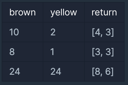 이를 이용해서 가능한 사각형의 가로와 세로를 구한 후, 내부 영역의 크기가 yellow와 같다면 가로와 세로를 반환하는 방법으로 풀이했다.