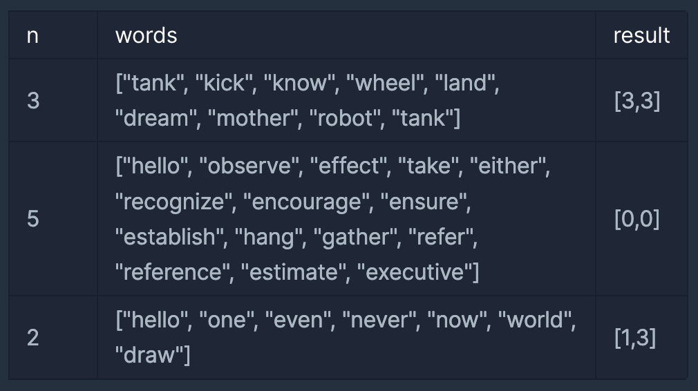 words는 끝말잇기에 사용한 단어들이 순서대로 들어있는 배열이며, 길이는 n 이상 100 이하입니다.