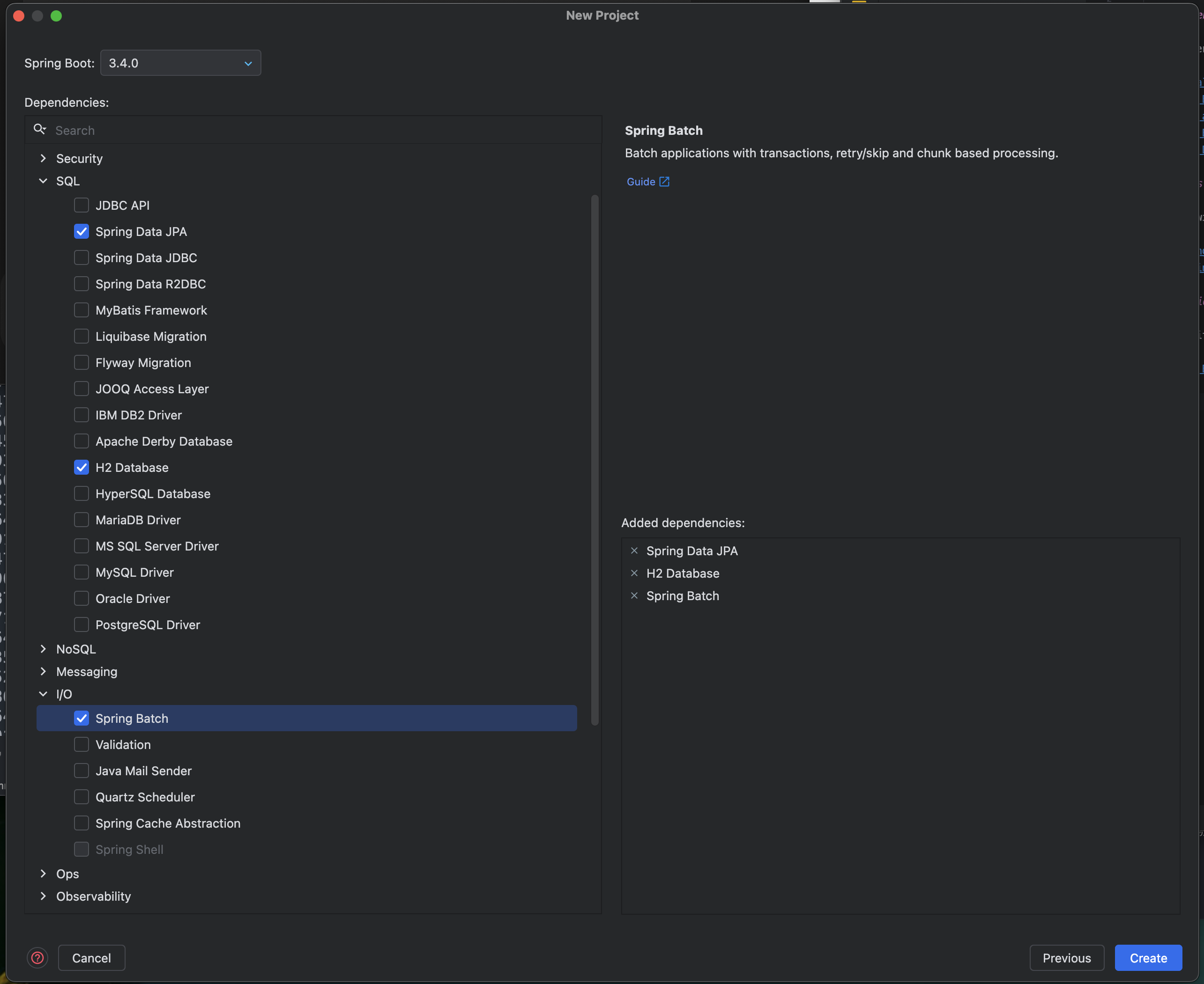 JPA, H2 Database, Spring Batch를 추가하여 프로젝트를 생성한다.