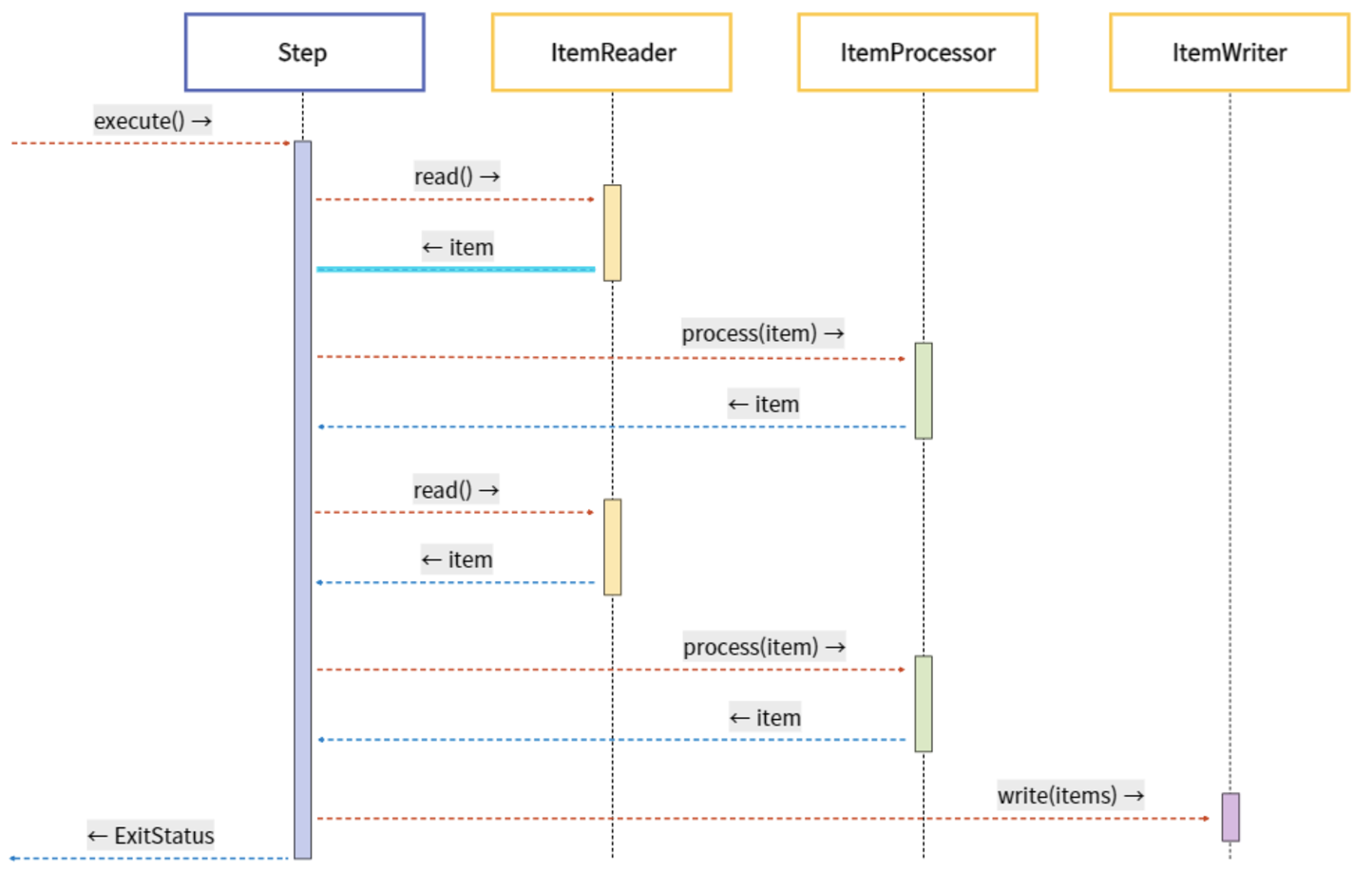 ✓ Step이 중지될 때까지 execute 메서드가 계속 반복해서 수행되고, 수행될 때마다 독립적인 트랙잭션이 얻어짐