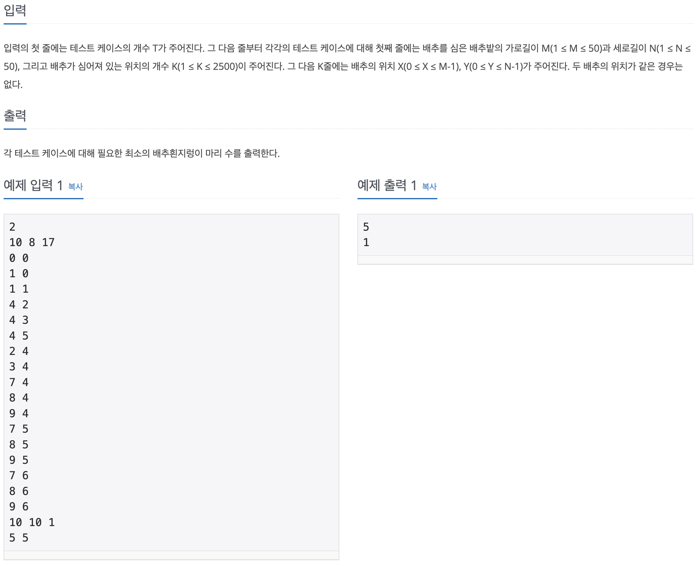 배추의 위치를 입력받아 해당 위치를 1로 변경합니다.