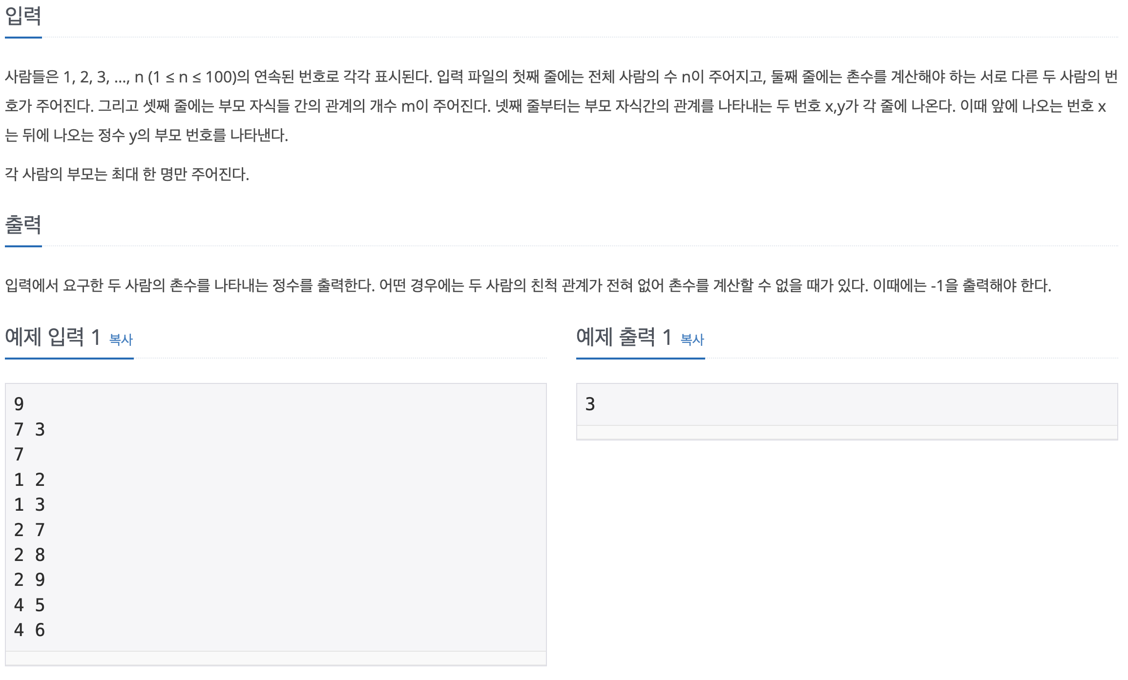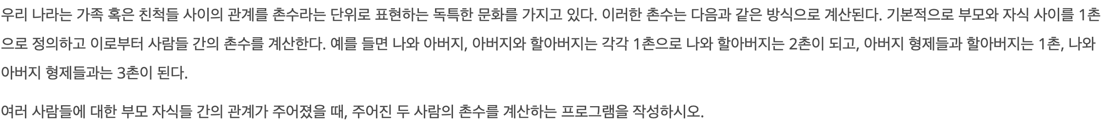 DFS알고리즘을 사용하여 가족수만큼 반복하고, 대상 A를 기준으로 나머지 가족과의 촌수를 계산한다.