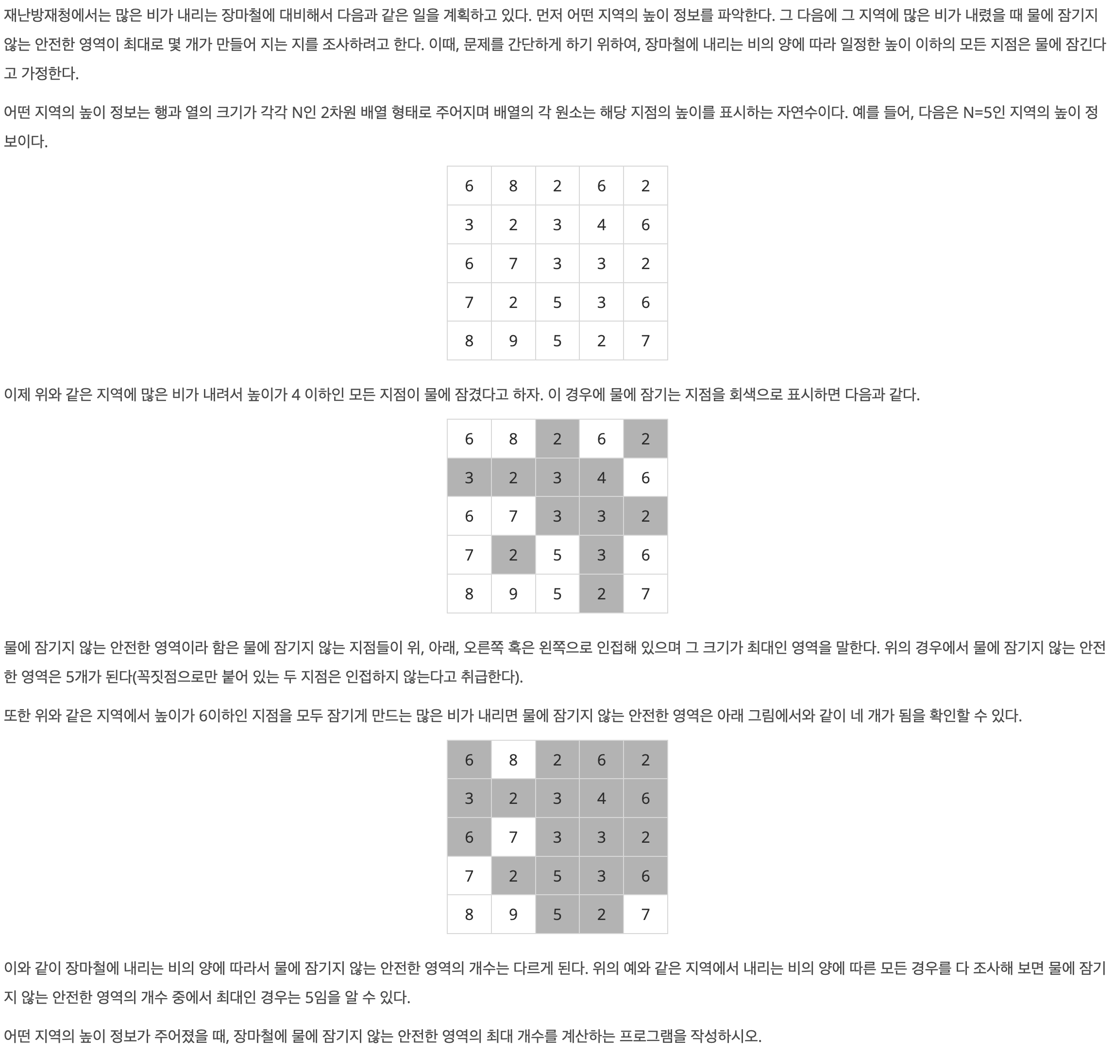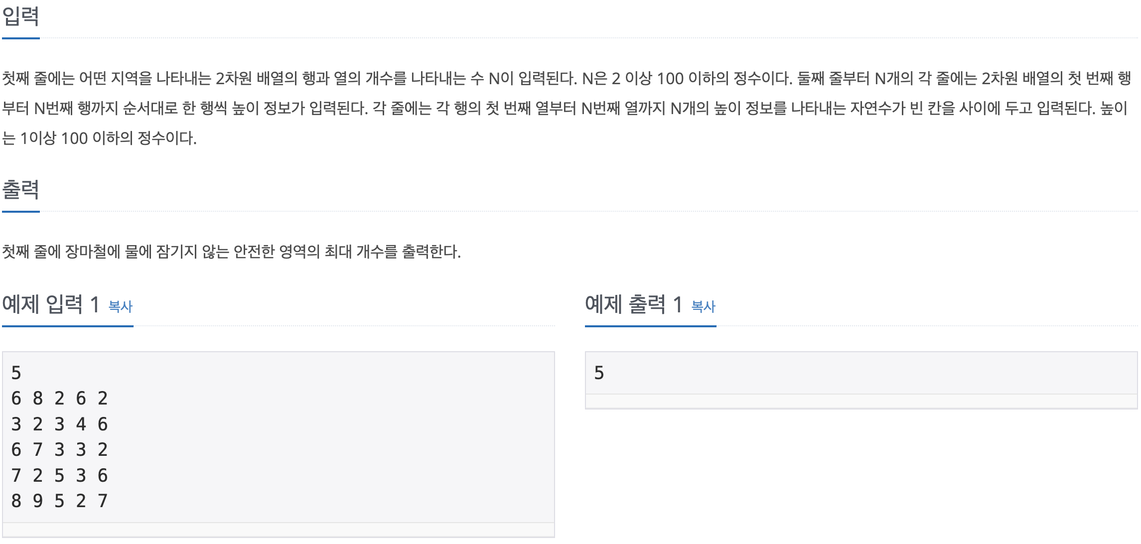 높이가 가장 큰 영역을 MAX로 두고 비의 양을 1부터 반복하여 비의양별 안전영역의 수를 구하는 방법으로 풀이했다.