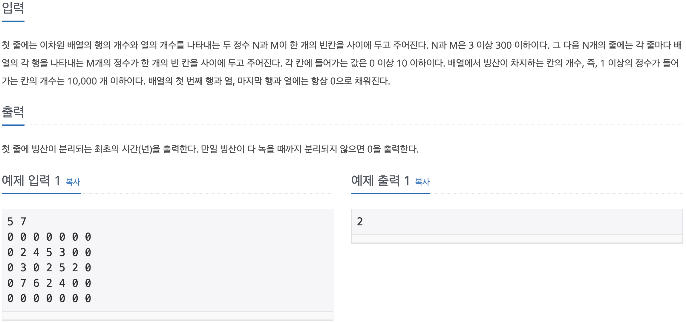 한 개의 빙산이 두 개 이상의 빙산으로 쪼개지는 데 걸리는 시간을 구하는 문제이다.