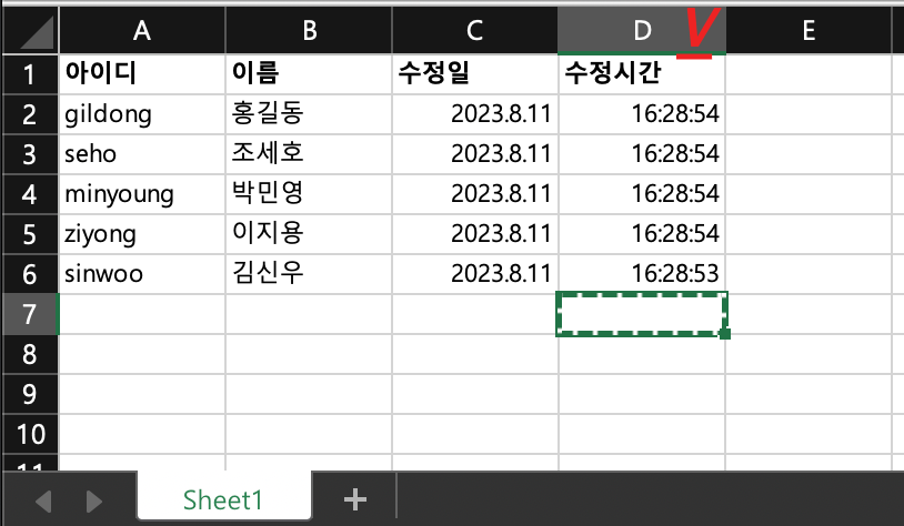 예제로 아래와 같은 엑셀을 전달받을 경우 처리하는 방법에 대해 작성하겠다.