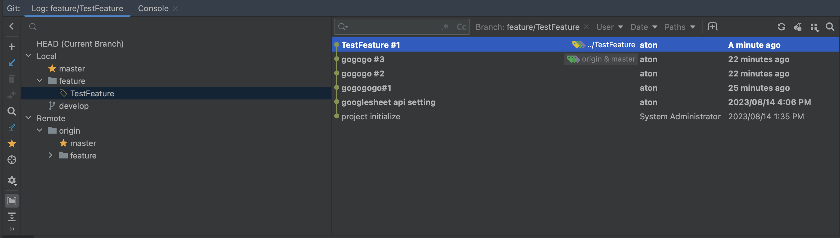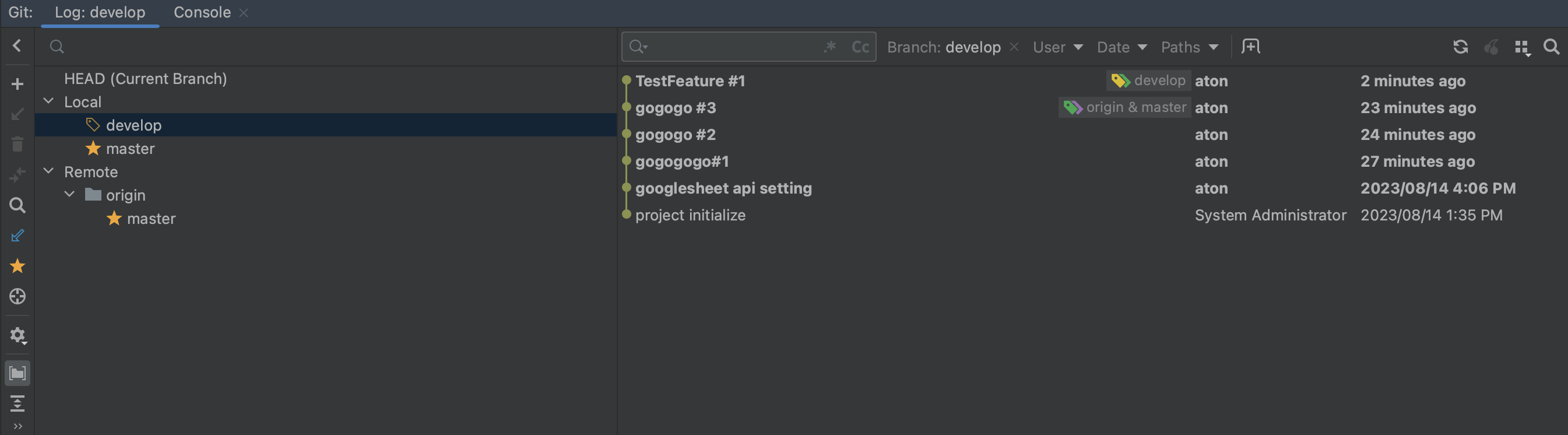 종료하게 되면 develop 브랜치로 merge되는 것을 확인할 수 있다.