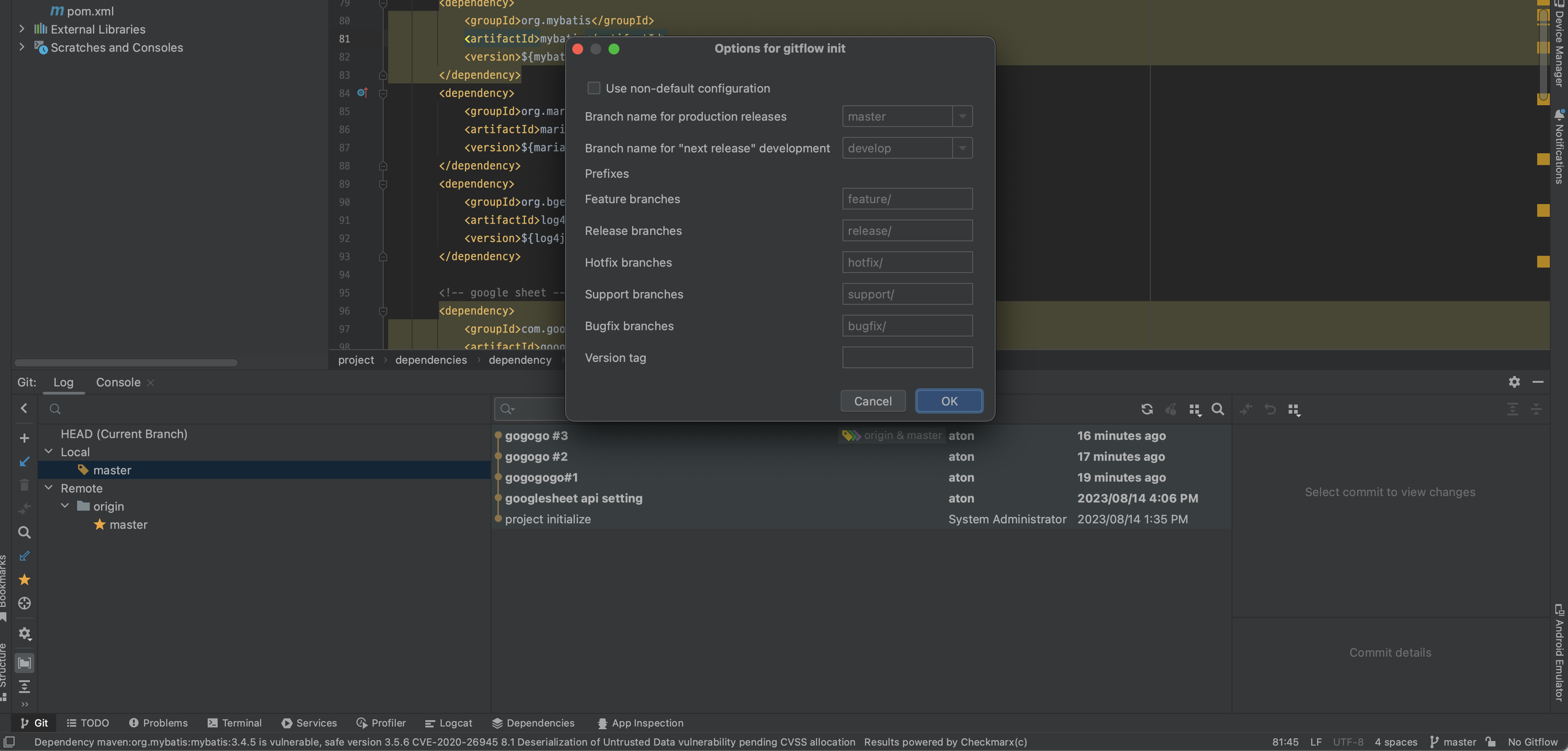 2) Git TAB에 들어가 우측하단에 Gitflow -> init Repo로 repository를 초기화 한다.