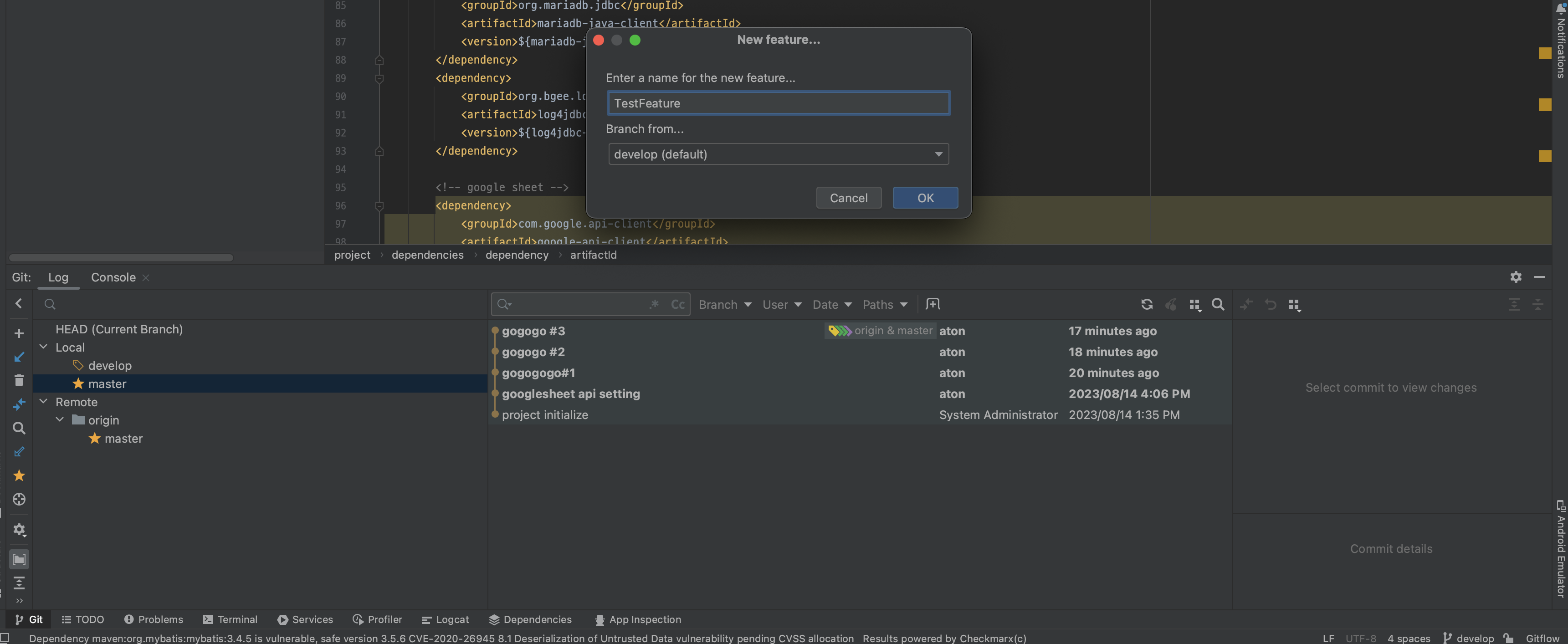 3) 다시 Gitflow를 클릭 후 Start Feature 버튼을 클릭하고 원하는 부모 Branch와 원하는 이름으로 feature를 생성한다.