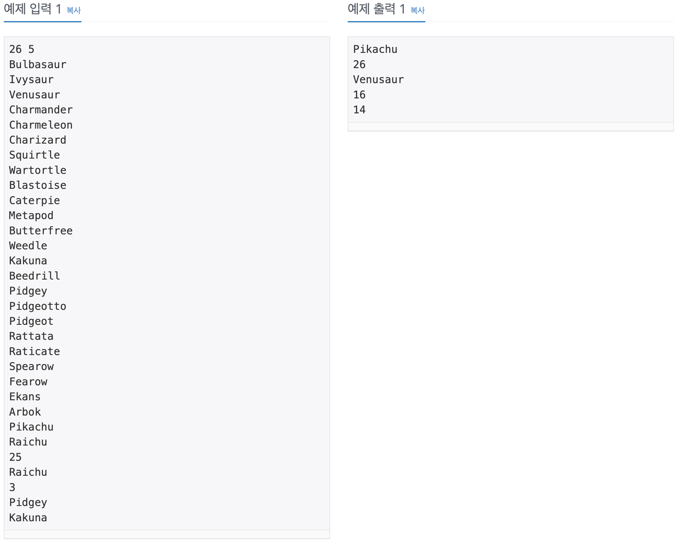 첫째 줄에는 도감에 수록되어 있는 포켓몬의 개수 N이랑 내가 맞춰야 하는 문제의 개수 M이 주어져. N과 M은 1보다 크거나 같고, 100,000보다 작거나 같은 자연수인데, 자연수가 뭔지는 알지? 모르면 물어봐도 괜찮아. 나는 언제든지 질문에 답해줄 준비가 되어있어.