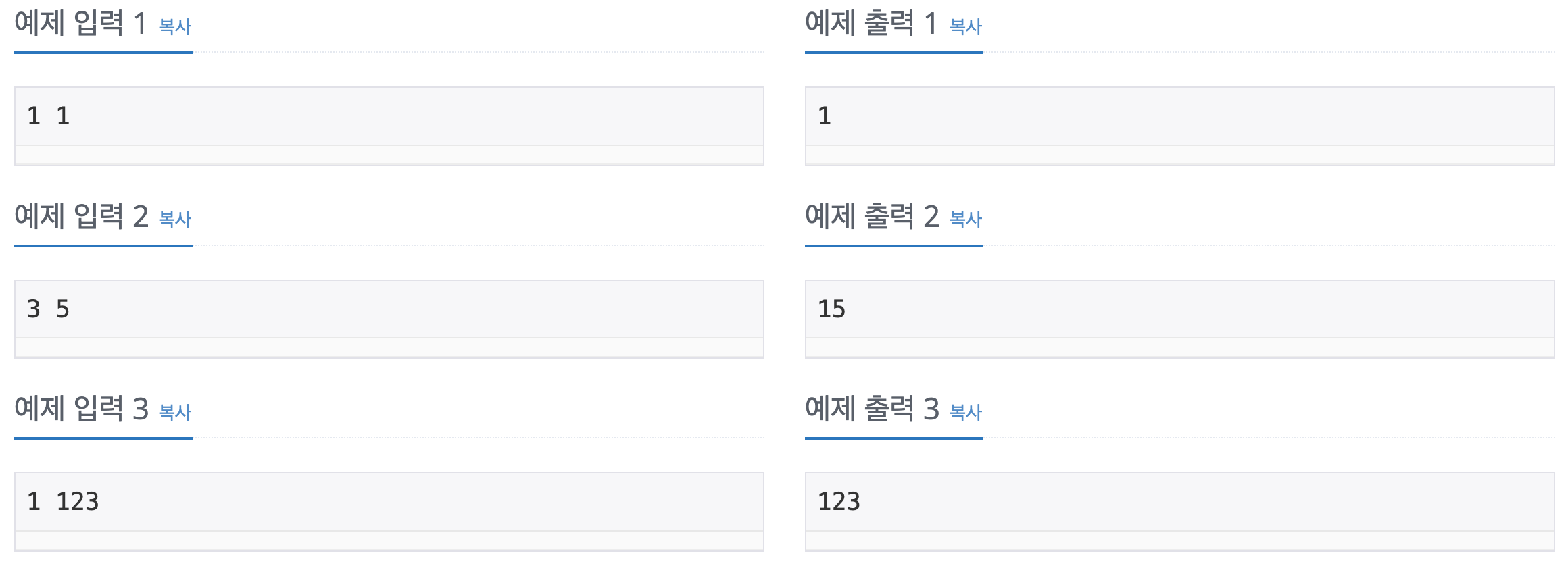 문제 두 자연수 A와 B에 대해서, A의 배수이면서 B의 배수인 자연수를 A와 B의 공배수라고 한다. 이런 공배수 중에서 가장 작은 수를 최소공배수라고 한다. 예를 들어, 6과 15의 공배수는 30, 60, 90등