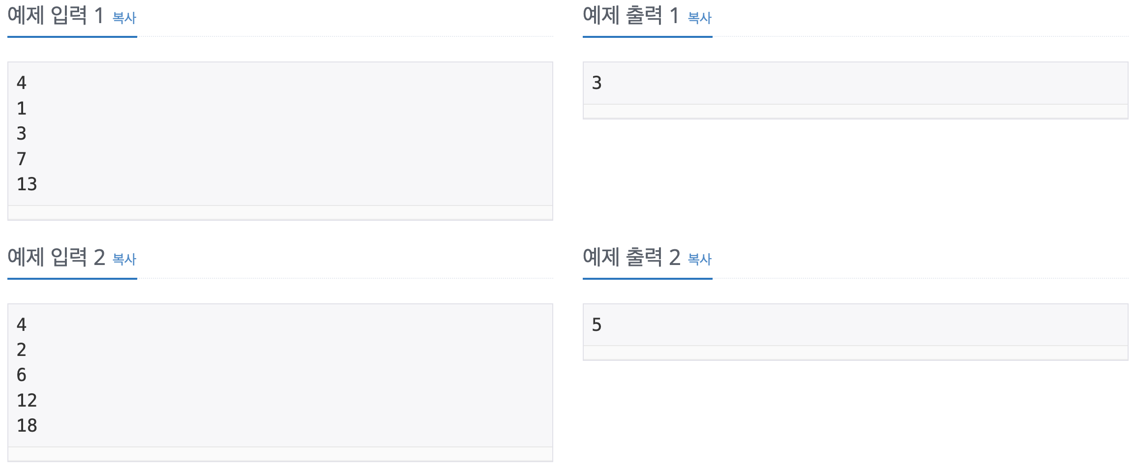 4. 시작과 끝 가로수의 길이를 최대공약수로 나누고 1을 더한 후 현재 심어진 가로수의 개수를 빼준 값을 출력한다.