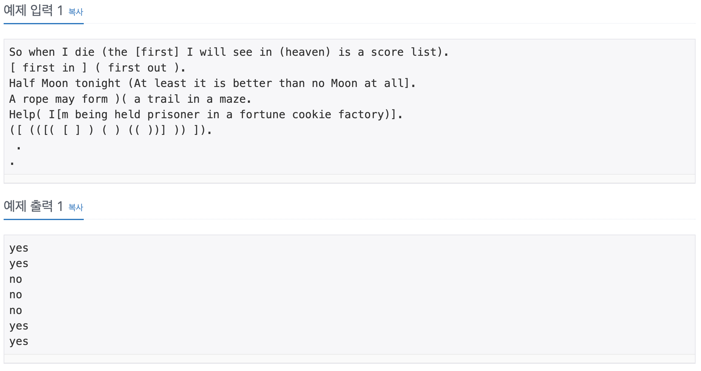 각 문자열은 마지막 글자를 제외하고 영문 알파벳, 공백, 소괄호("( )"), 대괄호("[ ]")로 이루어져 있으며, 온점(".")으로 끝나고, 길이는 100글자보다 작거나 같다.