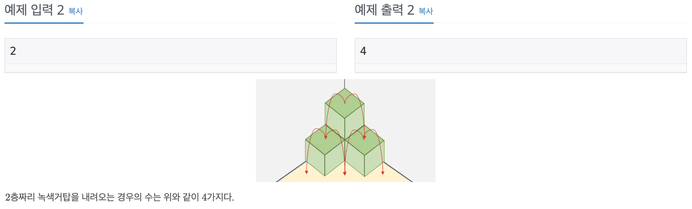 - 녹색거탑이 층이면, 총 개의 블록을 이용한 최단 경로로만 내려온다.