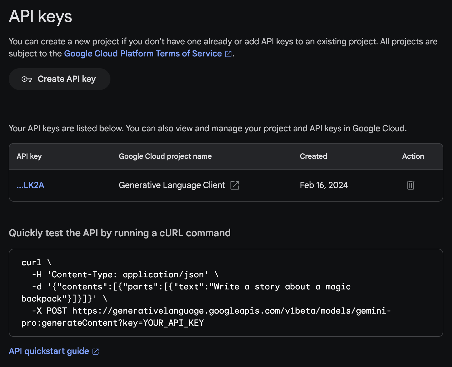 Get API Key in Google AI Studio -> Get API KEY -> Create API Key