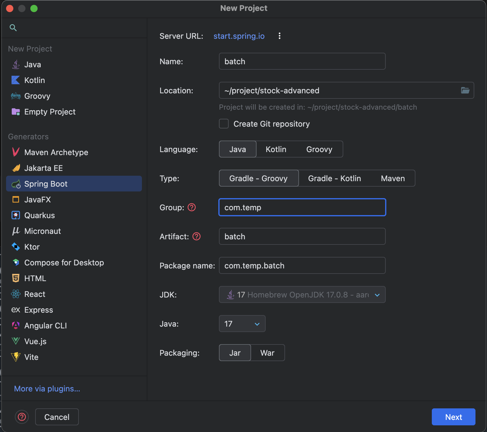 개요스프링 배치(Spring Batch)는 대량의 데이터를 처리하는 데 특화된 배치 프로세싱 프레임워크이다.데이터 읽기, 처리, 쓰기 과정을 간단하게 설정할 수 있게 설계되어 있다. 프로젝트 생성IntelliJ를 사용한 프로젝트 생성 방법이다.JPA, H2 Database, Spring Batch를 추가하여 프로젝트를 생성한다.// build.gradleplugins { id 'java' id 'org.springframework.boot' version '3.4.0' id 'io.spring.dependency-management' version '1.1.6'}group = 'com.temp'version = '0.0.1-SNAPSHOT'java { toolchain { ..